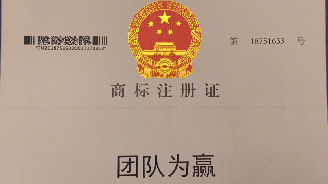 2017年2月,团队为赢申报的"团队为赢"R商标,顺利通过国家工商行政管理总局商标局的审定,被核准为第45类正式注册商标。团队为赢一向重视商标品牌战略,此次"团队为赢"注册成功并核发R商标注册证,是团队为赢品牌化战略的里程碑式的标志。